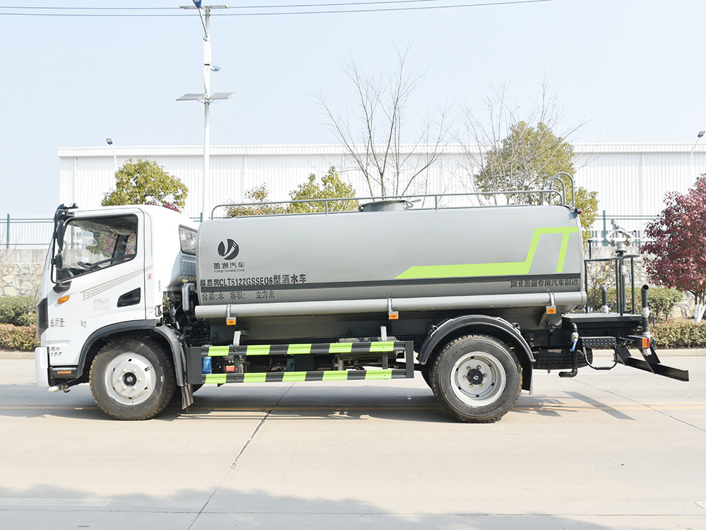 產品主要技術參數 序號 名稱 型號、規格 1 整車型號 CLT5122GSSEQ6 型灑水車 2 發動機型號 YCY30165-60 3 發動機馬力/功率 玉柴 165 馬力/121KW 4 發動機排量 2970ML 5 變速箱 萬里揚 6 檔 6 輪胎規格 8.25 鋼絲胎 7 軸距 3800 8 總質量 11990KG 9 整備質量 4575KG 10 額定載質量 7220KG 11 整車尺寸(長×寬×高) 7.2*2.25*2.8 12 罐體容積 9.3 方 13 燃料種類 柴油 14 排放標準 國六 15 水泵型號 40/50 16 罐體材質 Q235 碳鋼