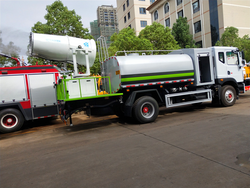前噴后灑,前裝有鴨形噴嘴或圓頭沖嘴,后面裝有圓柱開灑水噴嘴或蓮蓬頭噴嘴,后部有一工作平臺,裝配有高壓水炮。后部還可裝8個噴嘴(選裝)噴水器一般用于沖洗街道。