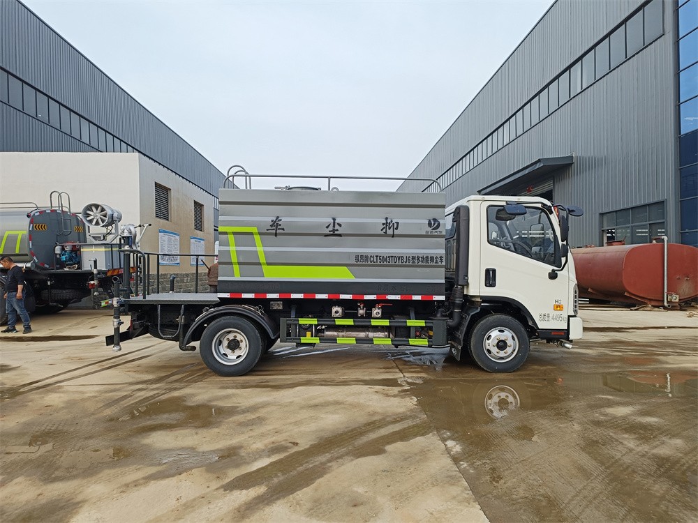藍牌灑水車產品主要技術參數 序號 名稱 型號、規格 1 整車型號 CLT5043TDYBJ6 型多功能抑塵車 2 發動機型號 Q23-115C60 3 發動機馬力/功率 全柴 115 馬力/85KW 4 發動機排量 2300ML 5 變速箱 萬里揚 5 檔 6 輪胎規格 7.00 鋼絲胎 7 軸距 3360 8 總質量 4495KG 9 整備質量 3800KG 10 額定載質量 500KG 11 整車尺寸(長×寬×高) 5.998*1.99*2.6 12 罐體容積 5 方 13 燃料種類 柴油 14 排放標準 國六 15 水泵型號 40/50 16 罐體材質 Q235 碳鋼