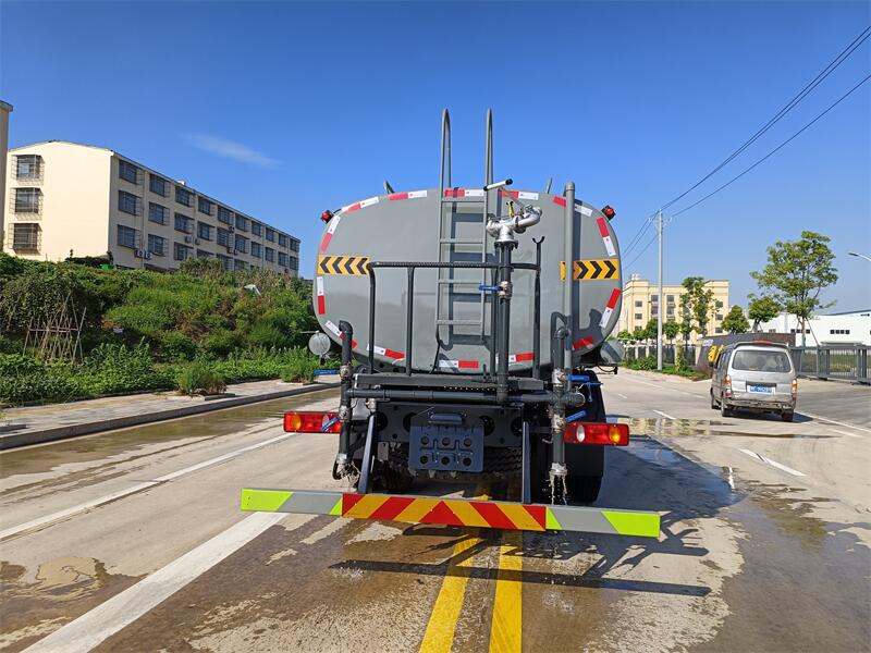 罐體總容量:10.5立方米;罐體有效容積:10立方米;罐體外形尺寸(長×長軸×短軸)(mm):4200×2300×1450;ABS型號:3631010-C2000,J ABS;ABS生產企業:東科克諾爾商用車制動系統(十堰)有限公司,焦作博瑞克控制技術有限公司;隨底盤選裝駕駛室;側、后防護材料均為:Q235碳鋼,連接方式均為:螺栓連接,后部防護截面尺寸(mm):120×50,后部防護離地高度(mm):450;專用功能及裝置:該車主要用于路面灑水及園林綠化;主要裝置為水罐及噴灑裝置;其他說明:僅采用3950mm軸距;選裝噴灑裝置樣式,選裝后部箭頭燈裝置,選裝弧形噴灑裝置,選裝水炮支架位置,選裝自動球閥安裝位置,選裝自動炮裝置樣式,前伸500mm,整車長度為8150mm。