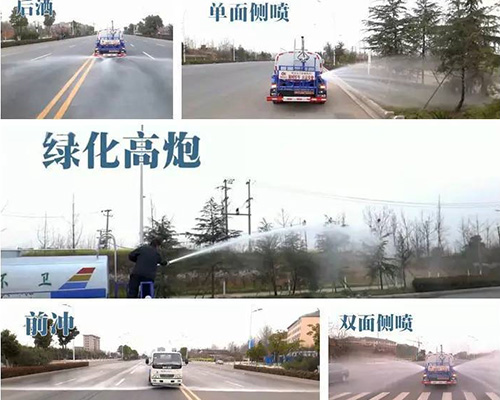 標準配置灑水車主要裝備有:前沖(沖洗公路路面)、后灑(公路路面養護)、側噴、高位側花灑(路邊綠化帶優化);后工作平臺高壓水炮,可調節成柱狀,射程≥28m;也可調節成霧狀,射程≥30米,水泵自吸高度:≤7m,灑水寬度:≥15m。側防護網,自流閥,消防接頭。灑水車水泵為常壓水泵,功能可以抽水、排水。另外根據用戶要求,可加消防泵、噴霧機、農藥卷盤、農藥柱塞泵。罐內可以做防腐防銹、電磁閥氣動閥自動放水等****,以滿足不同用戶需求。
