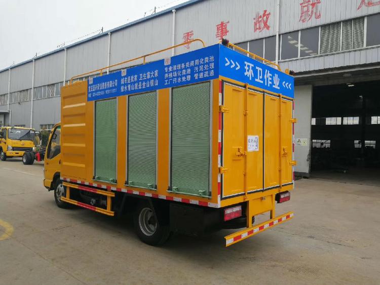 底盤型號:EQ1041SJ3BDF,發(fā)動機玉柴YC4FA115-50,7.00R16鋼絲胎,帶動轉,氣剎,方向助力,整車顏色工程黃。 上裝配置:18.5千瓦電機1臺,配電柜1臺,4寸排污泵一臺,5.5KW水循環(huán)真空泵1臺,3方高壓水箱,1.5立方液壓絞龍式/滾筒式污水分離箱,帶高壓清洗功能,采用意大利普蘭索特16MPA高壓泵,箱體材質采用熱板制作,后部帶LED屏,配工具箱一個。100mm吸污管4根(每根6米),60米Ф19mm的高壓管,帶10個噴頭。