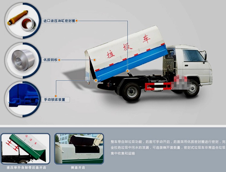 密封式垃圾車又稱自卸式垃圾車,主要由汽車底盤、箱體、開門機構、舉升機構、電液控制系統(tǒng)等組成,是一種新型機、電、液一體化的全密封結構垃圾運輸車輛,它不但可與LSY系列垃圾站配套使用,也可廣泛用于城鎮(zhèn)居民生活區(qū)、工業(yè)區(qū)、商業(yè)區(qū)、學校、公園、風景區(qū)等場所的垃圾運輸工作
