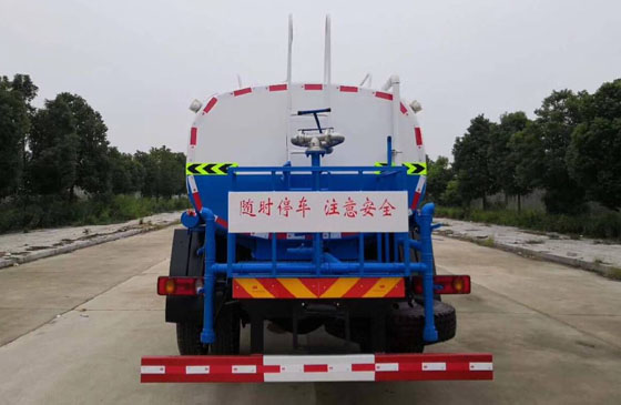 灑水車前沖(噴)后灑,帶側噴,罐體后帶工作平臺,平臺上安裝綠化灑水炮,灑水炮可全方位旋轉,可連續調成直沖狀、大雨、小雨、毛毛雨,帶安全護欄,配備全國質量評比第一名的杭州威龍大功率專用灑水泵,泵可自吸自排,安裝過濾網,帶消防接口,可通過消防栓進水,帶自流閥,隨車選裝20米綠化卷盤,可噴灑農藥,罐體金屬漆。