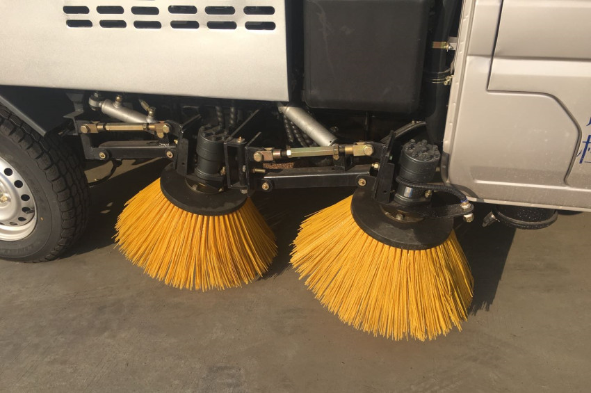 7、左右立掃為雙掃盤,前掃盤帶自動(dòng)避讓功能,減少了掃刷的數(shù)量和掃刷消耗量,能降低使用成本。掃刷上加裝噴水裝置,用于噴霧降塵