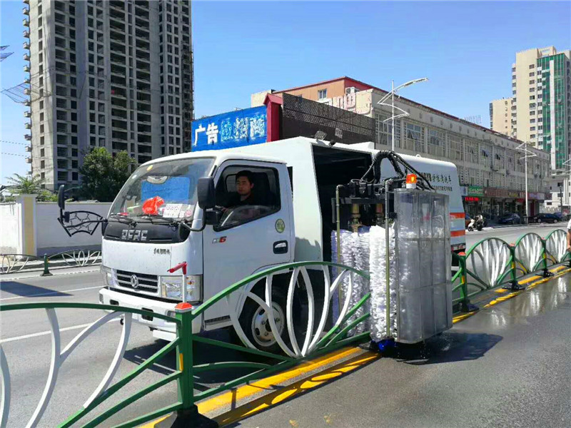 城市道路隔離護欄專用車:是采用毛刷擦洗和高壓水沖洗相結合的作業方式,進行清洗城市道路隔離護欄的,中置四根高壓噴桿,噴出水壓高達24兆帕,能輕松解決護欄上面的粘浮垃圾及灰塵泥土,四根立式滾刷(尼農條和粘連布組合材質)夾緊護欄高速轉動,將護欄上的頑固污漬、油漬輕松擦除,其中前置兩排高壓噴桿進行第一次高壓沖洗,然后四根立式滾刷進行兩次強力擦洗,最后后置兩根高壓噴桿進行二次沖洗,清洗過后護欄潔凈如新。