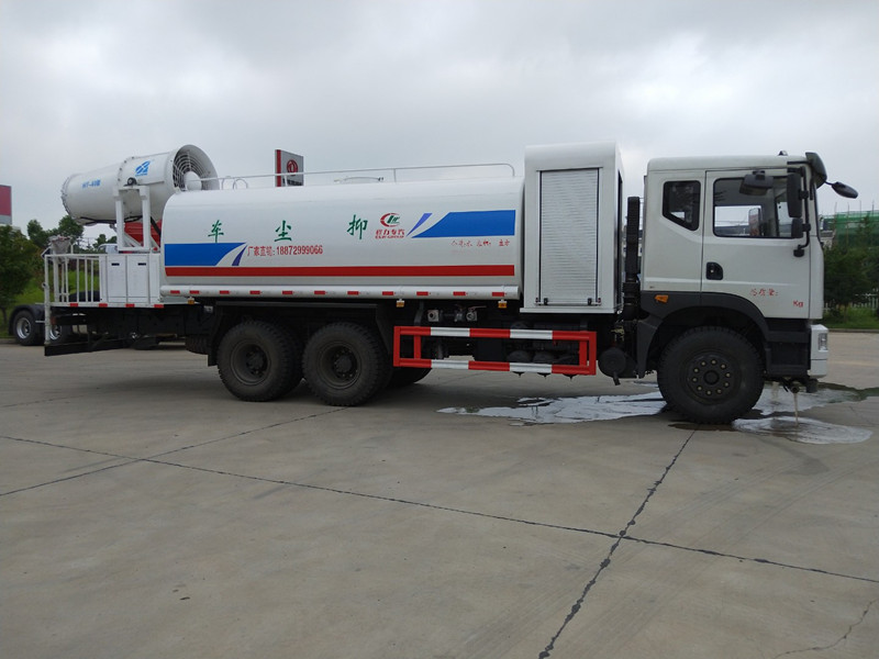 “霧炮車”學名為灑水車,多功能抑塵車,平時主要用于道路降塵、綠籬沖刷、減霾降霾。抑塵車車廂儲水量多達15噸,車尾噴霧器內波輪葉片飛速運轉將水化為霧氣噴出,噴射的水霧顆粒能達到微米級,瞬間可將漂浮在空氣中的揚塵和顆粒物壓至地面。在波輪葉片飛速運轉的作用下,霧炮車射程能達50到100米,噴射的扇形弧能達80米,水霧噴射不僅節約了用水量,還能實現精準降塵。