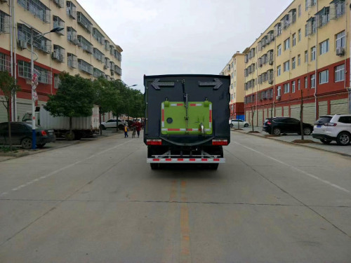 上裝采用中置四掃盤、吸掃結合、濕式除塵的方式對路面進行清掃、保潔作業,標配江鈴副發動機,馬達、施耐德控制開關、電磁閥組、變速自分離式離合器、免維護自動離心式風機、不銹鋼水箱和垃圾箱、垃圾箱可舉升自卸。清掃寬度為2.8-3.2m,吸入粒度直徑120mm,清掃速度每小時5-20Km。