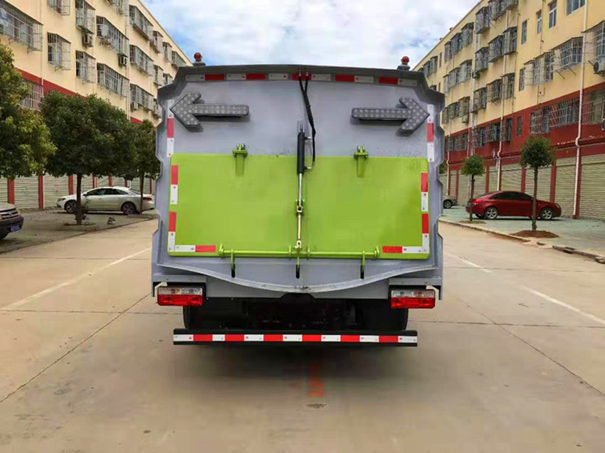 它的上裝標配置:帶4個掃盤、江鈴78馬力副發動機、三洋馬達、施耐德控制開關、海普瑞斯電磁閥組、無級變速自動離合器、免維護離心式自動風機、不銹鋼垃圾箱、北極星電子水泵、尾部LED箭頭指示燈、手動泵應急系統、垃圾舉升自卸功能。