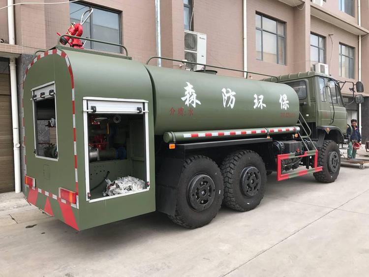 越野灑水車水罐體上裝配置:罐體采用碳鋼Q235板材,板材厚度4mm,罐體容積10-12立方,安裝全功率夾心取力器,CB10/40型消防水泵,帶PS40消防水炮一個,射程大于55米,后置工作泵箱,消防栓接口左右各一個,駕駛室頂部安裝長條警燈帶喊話器,全車顏色軍綠,兩側噴涂白色森林消防字樣。