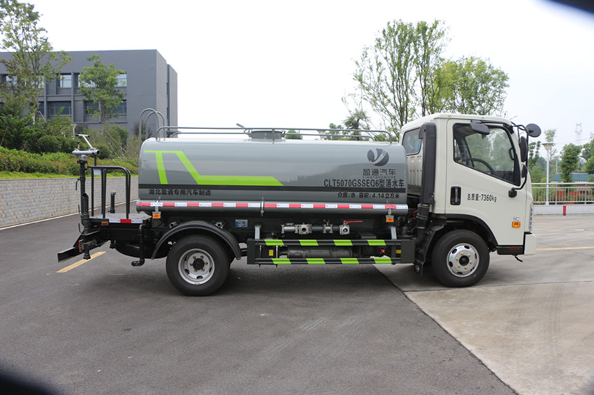 1.福田3噸灑水車帶前沖(噴),后灑,側噴,罐體前端裝有透明量管一根,與罐體內相通,用來觀測罐體內水的多少,罐體側面裝有炮筒兩套,炮筒內裝有兩根2米抽水鋼絲塑料管,抽水管兩端裝有子母頭方便連接,用于抽水作業使用;罐體后帶工作平臺,平臺側面焊接登臺踏板,平臺上帶安全護欄,裝高位綠化灑水炮一個,灑水炮可全方位360度旋轉,可連續調成直沖狀、大雨、小雨、毛毛雨等不同噴灑方式,調成直沖狀射程長度≥20m、高度≥9m,調成細雨狀射程寬度≥12m;后工作平臺下用槽鋼連接焊有8mm厚保險杠,大大提高了灑水車的主動安全性。